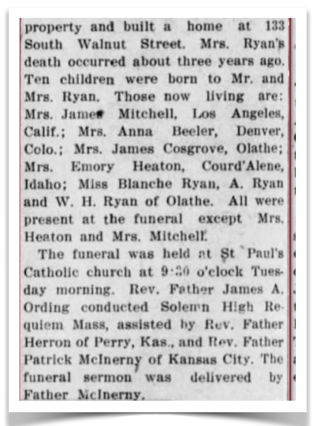 Lawrence Ryan died on March 22, 1912. Obituary mistakenly says 10 children. Three of their thirteen children died in childhood.